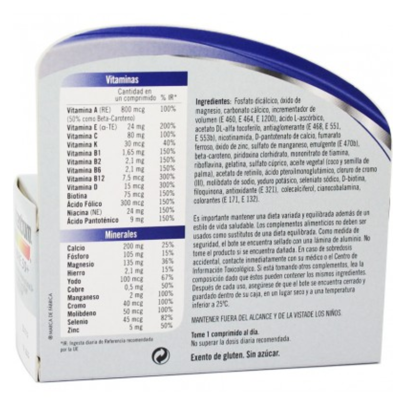 Por ello, multicentrum hombre 50+ cuenta con vitamina c y selenio que contribuyen al funcionamiento normal del sistema inmunitario. Complementado con vitamina a que contribuye al mantenimiento de la visión en condiciones normales y con ácido pantoténico que ayuda al rendimiento intelectual normal. Con zinc y hierro que ayudan a la memoria y a la función cognitiva.