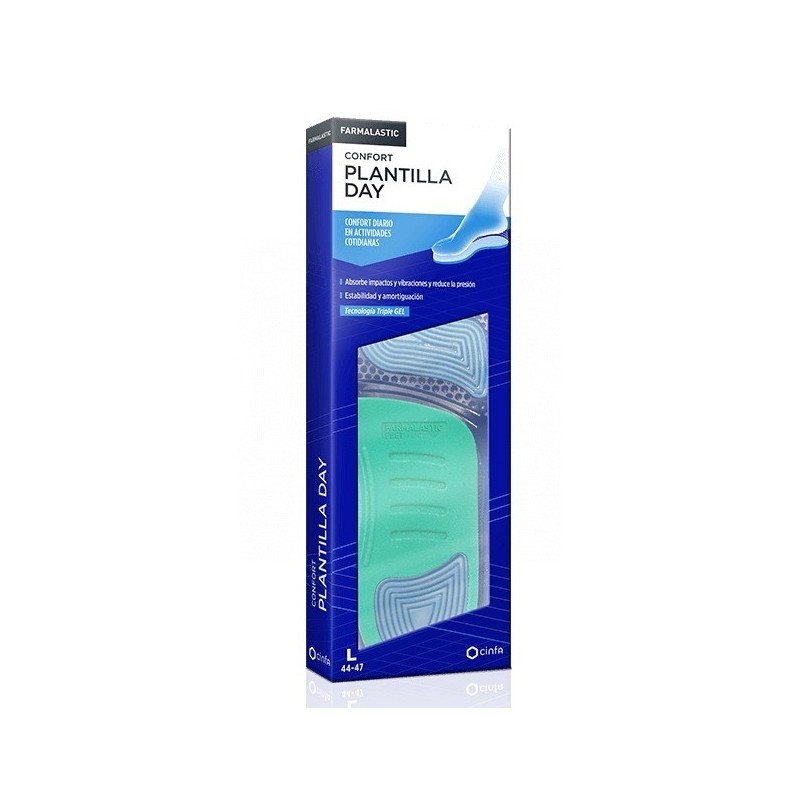 Las plantillas DAY de Farmalastic están desarrolladas con Tecnología Triple Gel TPE (Thermoplastic Elastomer) que ayudan a absorber los impactos y vibraciones de forma eficaz y a reducir la presión que los pies soportan a lo largo del día. Ayudan a proporcionar de forma reforzada mayor estabilidad y soporte en el arco plantar y amortiguación en metatarso y talón. Su sistema de tallaje y ajuste permiten una adecuada adaptación anatómica de cada talla al número de calzado. Pueden utilizarse con el calzado habitual o deportivo.